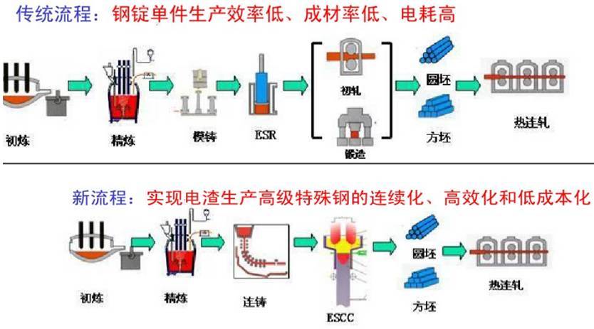 為解決電渣重熔技術(shù)電耗較高、批量少管理不便、生產(chǎn)效率低等局限性特點,冶金工作者也在不斷的創(chuàng)新和完善電渣重熔技術(shù),如電渣連鑄技術(shù):
